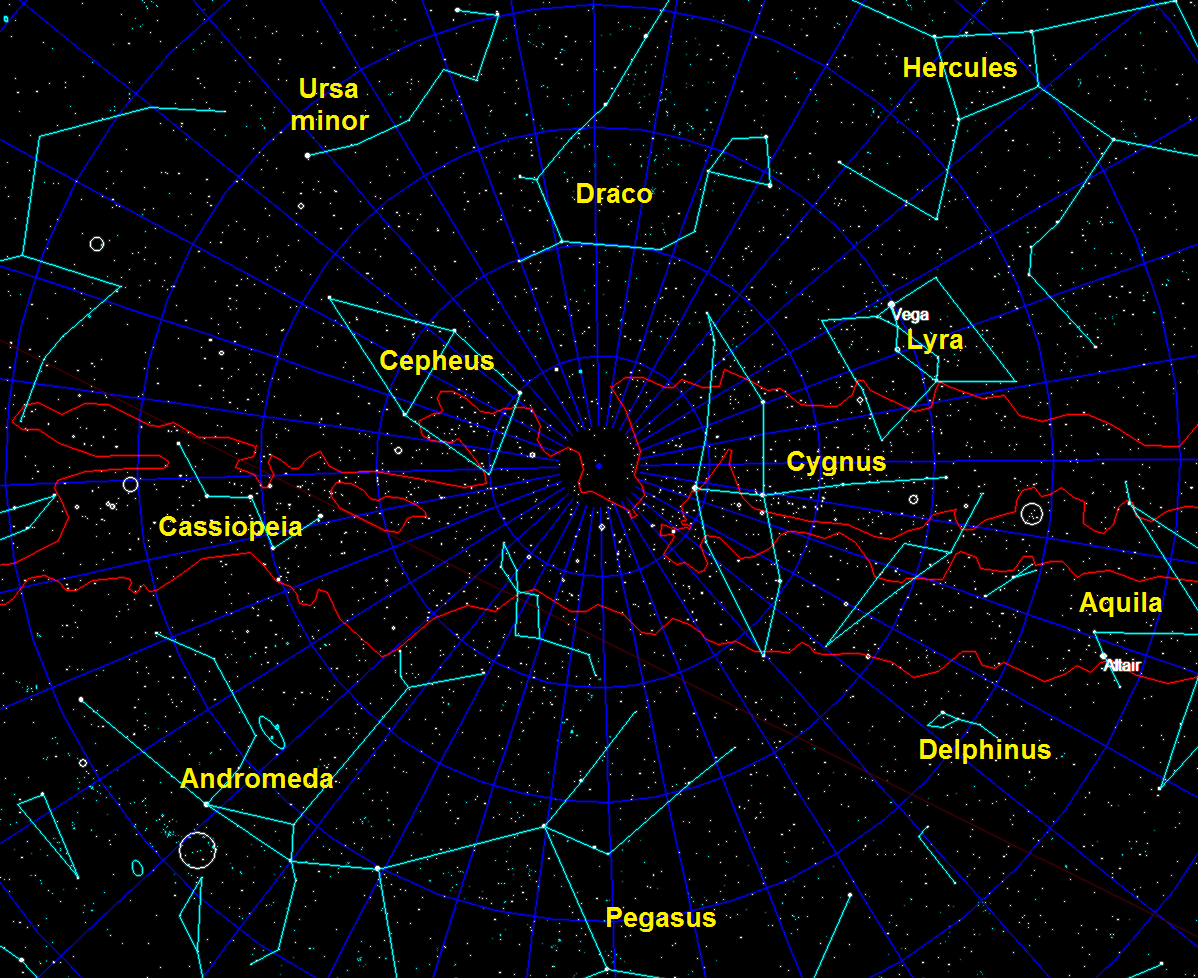 Mars’ north pole points to a location in Cygnus almost 30 degrees away from Polaris, with only barely visible stars nearby. Sadly, the closest easily visible stars are about 9 degrees away, not great for guidance. On the plus side, one of those stars is Deneb, the 19th brightest star and therefore very easy to find.