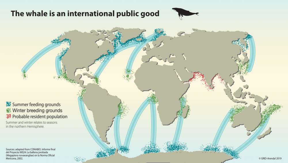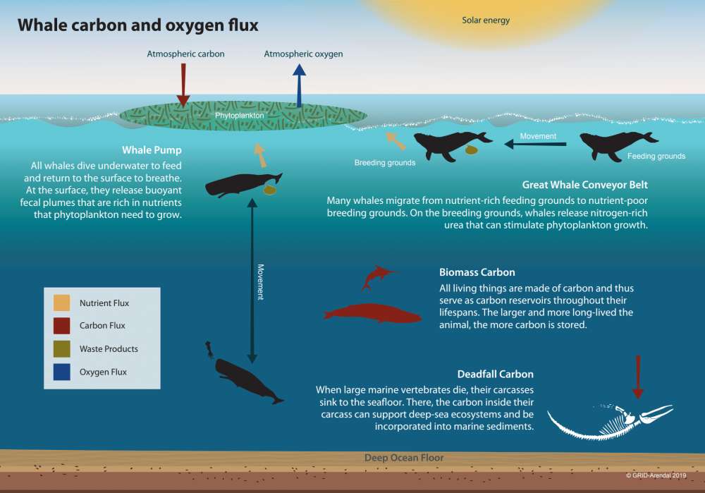 Today there are an estimated 1.3 million whales in the world, down from 4-5 million before industrial hunting, so the oceans have the capacity to support many more. The authors calculate restoration of previous whale numbers would boost oceanic drawdown by 1.7 billion tonnes (1.87 billion tons) of CO2 a year.
